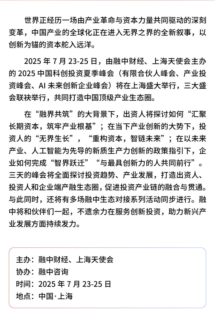 7月23-25日上海,LP峰会、产业投资峰会、AI未来创新企业峰会,联袂举办。